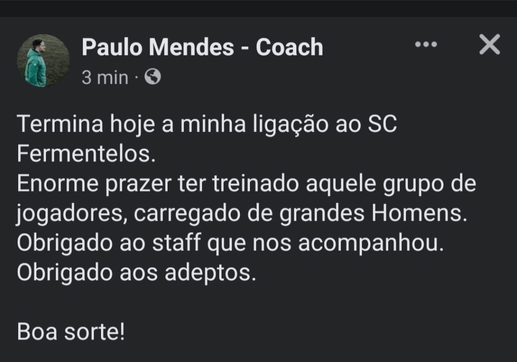 Numa curta mensagem o Mister Paulo Mendes, treinador do Fermentelos, anuncia a sua saída do Clube da Pateira.